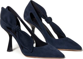 Asymmetric cutouts and a pronounced bow enrich the side panels of a pointy-toe pump featuring a supple suede upper and lifted by a sculptural heel.