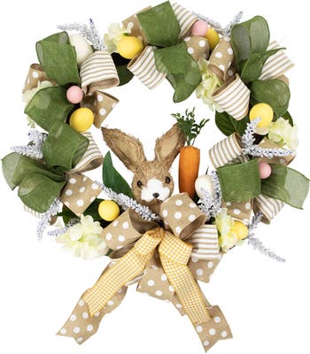 Celebrate the arrival of spring and the essence of Easter with this unique wreath. The various bow patterns of white and yellow houndstooth pattern, beige and white polka dots, and stripes, compliment the textured green burlap bows resembling greenery. The realistic, delicate blooms, white pip berries, and green foliage create a beautiful sense of nature. An inquisitive bunny with his tasty carrot completes the wreath at the bottom. Whether displayed on your front door as a welcome to guests or above your mantles as a focal point, it will create a warm and inviting atmosphere for family and friends. Features: Floral wreath for Easter or spring Accented with a textured brown bunny and carrot 3 bow patterns of houndstooth, stripes, and polka dots Solid green burlap bows intertwine the beige and white bows Hydrangeas with hues of yellow, white, and pink peak between the bows White pip berries and green leaves surround yellow and pink eggs Round natural twig grapevine backing with attached loop for hanging No assembly required, wreath comes in 1 piece Recommended for indoor use - if using outdoors place under a covered area Dimensions: 22" diameter (measured from outermost edge to outermost edge across the wreath) Measures 26" high with included hanging bows Material(s): polyester/wire/plastic/burlap/foam/wire/wood