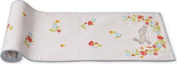 Say hello to spring. Our bunny runner is a stylish and functional addition to your springtime tablescaping essentials. Featuring 100% cotton construction with hand screen print, applique, embroidered, and french knot details, this runner is the perfect complement to the season's decor. Prewashed canvas with blanket stitch and dyed to match sheet backing.