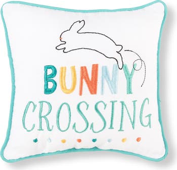 - Playful embroidered pillow features charming "BUNNY CROSSING" text with "BUNNY" in cheerful multicolor letters including turquoise, yellow, orange, and light blue, and "CROSSING" in elegant turquoise script, adorned with a leaping white bunny silhouette above and colorful dots below on crisp white background.
