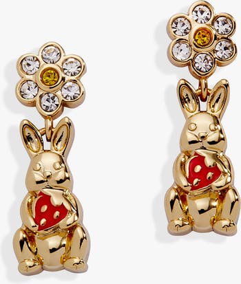 Adorable stud earrings featuring a sparkling crystal flower paired with a whimsical metal bunny charm clutching a cheerful enamel strawberry. Perfect for adding a touch of springtime fun and personality to any look.