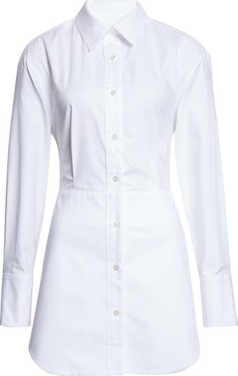 From the tenth-anniversary collection steeped in tried-and-true MONSE-isms, this crisp cotton-poplin shirtdress leans into the design duo's typical twisted tailoring with a paneled waist that gives ways to an open back bridged by bunny-eared ties.
