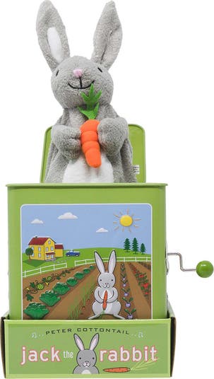 JACK IN THE BOX: Jack the Bunny! Jack-in-the-Boxes have been a time-honored favorite toy since the 1500’s! Classic old school toy recreated with modern artwork and cuddly puppet. Nothing is more surprising than when the song ends and he pops up! Musical Delight: Surprise your youngsters with our Bunny Jack in the Box. Made from sturdy tin with an adorable Bunny plush pop-up. Perfect for Gift-Giving: With its charming design and playful nature, Bunny Jack in The Box makes a wonderful gift for birthdays, holidays, or just because. A Treasured Keepsake: This Jack-in-the-Box is more than a toy—it's a timeless treasure. The tin box is beautifully embossed, adding rich texture and vintage charm to its classic design. Whether winding it up to hear the familiar tune or admiring its craftsmanship on a shelf, this piece is made to delight for years to come. Perfect as a gift, a nursery accent, or a collector's display, it's a keepsake you'll be proud to pass down. Mindfully Crafted: Safe for play. Constructed with all non-toxic paints and materials, Ages 3 years+. JACK RABBIT CREATIONS creates a twist on this classic, with all original art, cuddly plush characters, and unique play-along songs. Jack Rabbit Creations has proudly been a woman owned specialty toy company since 1996, and strives to create classic toys that are powered by a child's imagination instead of batteries. All designs are our own and are created by a network of like-minded moms. We use all non-toxic paints and materials because we are parents too!