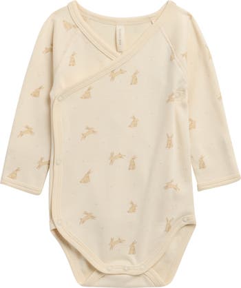 Happy bunnies hop across a stretch-kissed organic cotton bodysuit designed with two sets of snaps to make diaper changes easy-breezy.