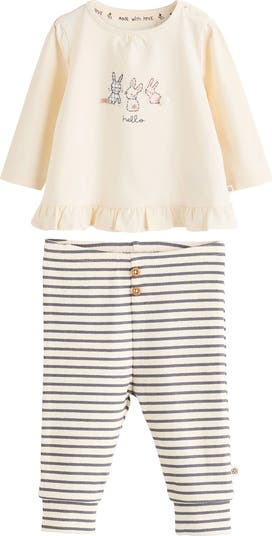 Pretty little embroidered bunnies with floofy tails gather atop this sweet long-sleeve shirt paired with striped leggings.