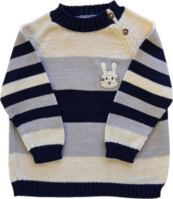 Wrap your little one in playful charm with this Bunny Striped Sweater, perfect for Easter and beyond! Featuring classic navy, light gray, and white stripes, this soft hand-knit sweater is both stylish and comfortable. A sweet embroidered bunny peeks out at the chest, adding a touch of whimsy to this timeless design. Thoughtful button details on the neckline make for easy on-and-off wear, ensuring both parents and kids love this piece.\nCrafted with care, this sweater offers warmth and durability while staying lightweight enough for layering. It’s the perfect blend of comfort and cuteness for family gatherings, Easter egg hunts, or cozy spring days.