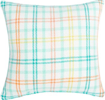 - This fresh accent pillow features a beautiful handwoven plaid pattern in cheerful spring colors including soft aqua, teal, coral pink, sunny yellow, and warm orange on a crisp white background, creating a light and airy look perfect for celebrating the Easter and spring season.