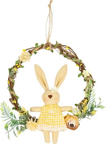 This festive wreath features an adorable bunny sitting proudly at its center, capturing the essence of Easter's joyful spirit. Featues a blend of yellow artificial flowers and greenery. It is the perfect addition to your doors, windows or walls. Product Features: Floral Spring bunny Easter wreath Girl bunny sitting in the center Wearing yellow and white dress with lace trim Decorated with greenery, orange and yellow flowers Constructed with wood twigs wrapped with jute cords No assembly required – wreath comes in 1 piece Comes ready to hang on a jute cord Recommended for indoor use - if using outdoors place under a covered area Dimensions: 10” high x 9" wide (width is measured from outermost tip/edge to outermost tip/edge across the wreath) Material(s): fabric/wood/plastic