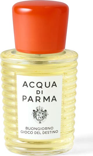 Fragrance story: Buongiorno Gioco del Destino captures the thrill of the unexpected, the exhilarating rush of chance that turns an instant into something unforgettable. A sophisticated twist on the modern gourmand palette, it introduces the surprising note of bran wheat absolute, with its toasted nuance that adds warmth and intrigue. Wrapped in the brightness of Italian green mandarin, yellow mandarin and Sicilian lemon, and deepened by musk, the fragrance balances freshness and comfort in a play of contrasts that lingers on the skin like a spark of destiny. The fragrance is presented in a bottle whose ridged glass form revisits and elevates a design drawn from Acqua di Parmas archives. Its sculptural texture catches the light with a modern elegance, while the crimson red colored glass cap adds a luminous contemporary accent.