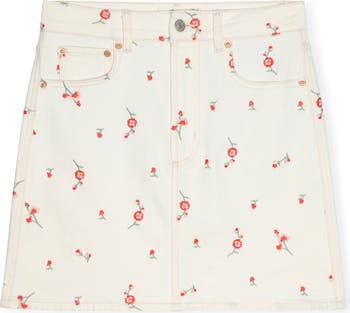 Embroidered flowers bloom in vibrant color throughout this miniskirt made from low-stretch denim in a crisp white wash.