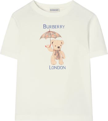A crew-neck T-shirt in soft cotton jersey, printed with our logo and Thomas Bear holding a Burberry Check umbrella. The back features artwork depicting London's Westminster Bridge and the Houses of Parliament.