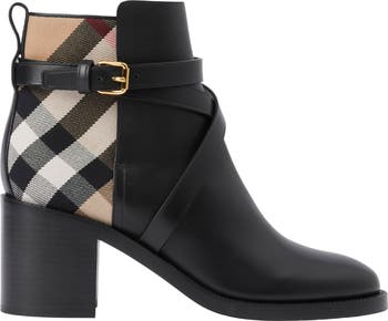 Canvas panels patterned in iconic checks bring a signature flourish to an equestrian-inspired bootie designed with wraparound straps and set on a block heel.