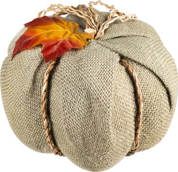 The perfect table top or mantle piece to add an autumn touch to your holiday decor. This pumpkin is free standing and has a folded burlap design. The neutral gray tone will compliment any country rustic setting. Features: Green burlap pumpkin Accented with an orange and yellow leaf Topped with a wooden stick for the stem with jute rope accents Recommended for indoor use Dimensions: 5.5" high x 6.75" diameter Material(s): burlap/polyester/jute/paper