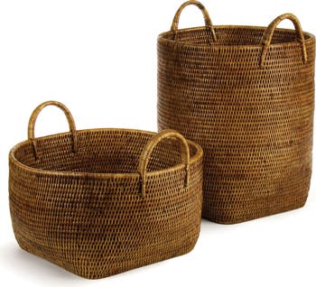 With one short and one tall profile, this versatile set is great for organizing odds and ends. The tight weave and warm polished finish make them ideal vessels.