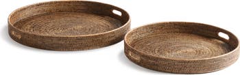 Burma Rattan Round Ottoman Decorative Trays Large Set of 2