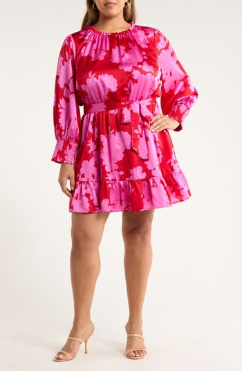 Ruffle trim adds a fun finishing touch to a floral-print dress cinched with a matching tie belt.