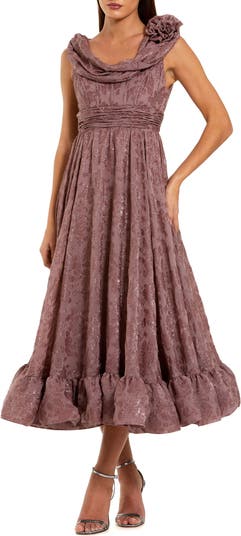 Vintage-inspired mauve midi dress with floral jacquard, draped neckline, rosette shoulder detail, and ruffled hem — perfect for elegant daytime events.
