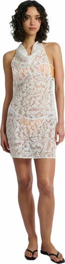 - Made from a floral burnout fabric, this dress is slightly fitted to the body and falls to a mini hem. designed with a high neck featuring an adjustable tie closure and an open back, both with a cowl-like drape.