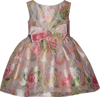 A satiny sheen defines each and every burnout bloom on this elegant, baby-size party dress defined at the waist by an oversized bow.