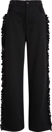Glossy petal-shaped paillettes cluster together down the sides of cotton nonstretch-denim jeans cut with a mid rise and wide legs.