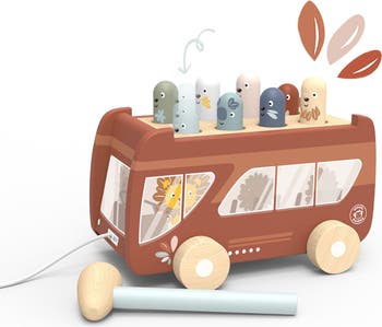 Enjoy this pull along bus that also offers a hammering activity. Includes 8 wooden characters and a sturdy hammer, have fun while developing hand/eye co-ordination! Tap tap your way to the Zoo and enjoy the day! This wooden toy is designed with gently curved edges and comes in our successful color palette. This toy is crafted from sustainably sourced wood from FSC® certified forests and coated with non toxic paint.