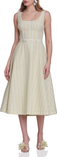 A gingham stripe motif brings timeless charm to this square-neck sundress designed with a bustier-inspired bodice. Seamed cups and contrast piping define the silhouette, while a removable belt highlights the waist. The full circle skirt adds graceful movement, creating a timeless look that's effortlessly summery.