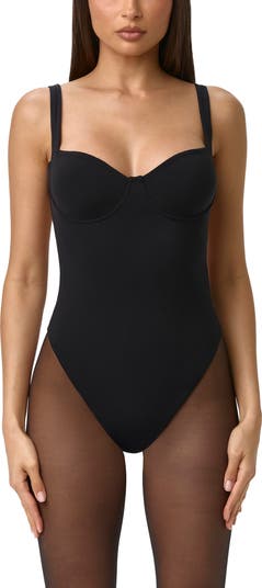 A bustier neckline enhances the sultry vibes of this figure-sculpting bodysuit finished with a cheeky back.