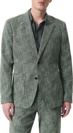A textured cotton blend in marled greens and whites keeps the look both relaxed and distinctive in a sport coat constructed with padded shoulders to emphasize its roomy fit. Styled with traditional notched lapels and patch pockets, it relaxes a semiformal look and elevates a casual outfit with a bold, standout finish.