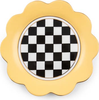 Set the table in style with this elegant porcelain plate featuring checks and petal-inspired scalloping.