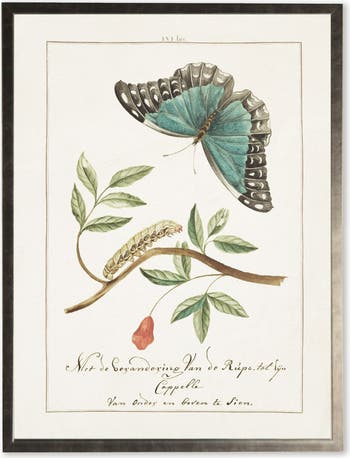 This vintage-inspired print, framed in a silver wooden frame, features a turquoise butterfly with a caterpillar. Sized at 16 inches by 20 inches, this made in the USA frame makes for a beautiful addition to any wall.