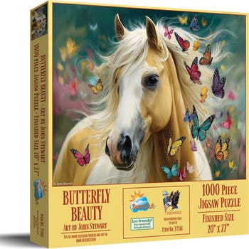 Butterfly Beauty 1000 pc Jigsaw Puzzle by SunsOut - 1000 Piece Jigsaw Puzzle - Completed Size: 20" x 27" - Puzzle Artist: John Stewart - Interlocking Pieces and Durable Construction: SunsOut jigsaw puzzles feature interlocking pieces that fit securely, making assembly easier and reducing frustration. -Ages: 15 years and older - Perfect for adults and seniors. SunsOut puzzles ensure high manufacturing standards ensuring their commitment to quality and customer service. - SunsOut puzzles use soy based inks, high quality puzzle board. As this is a jigsaw puzzle: assembly is required and batteries are not required.