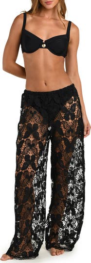 Fluttering butterfly-patterned lace adds semisheer charm to these flowy wide-leg pants that show off your suit underneath.
