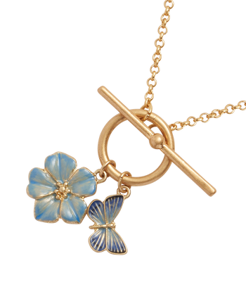 Keep these emblems of freedom and love close to your heart with our Butterfly & Flower Necklace. This T-bar design is gold-plated and each hand-painted enamel charm is suspended from a perfectly weighted single loop.