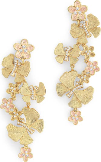 Part of a collection symbolic of change, renewal and strength, these gorgeous drop earrings capture the wonder of the connection between flora and fauna. Borrowing from Michael Aram’s iconic Butterfly Gingko motif, these statement earrings are plated in 18-karat gold and feature enameled flowers and gingko-tree leaves and twigs metamorphosing into sparkling butterflies.