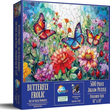Butterfly Frolic 500 pc Jigsaw Puzzle by SunsOut - 500 Piece Jigsaw Puzzle - Completed Size: 18" x 24" - Puzzle Artist: Kelly Roberts - Interlocking Pieces and Durable Construction: SunsOut jigsaw puzzles feature interlocking pieces that fit securely, making assembly easier and reducing frustration. -Ages: 15 years and older - Perfect for adults and seniors. SunsOut puzzles ensure high manufacturing standards ensuring their commitment to quality and customer service. - SunsOut puzzles use soy based inks, high quality puzzle board. As this is a jigsaw puzzle: assembly is required and batteries are not required.