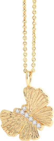 A crystal-detailed butterfly pendant etched with ornate ridges emphasizes the cottagecore-inspired charm of this necklace plated in high-polish 18-karat yellow gold.
