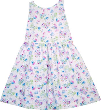 Graceful and airy, this youth girls' butterfly print dress features soft cotton poplin fabric with a beautiful butterfly design. Finished with charming bow-tied back straps, it's perfect for casual outings and summertime events.