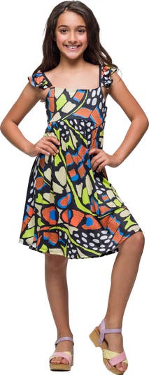 Stand out in this colorful butterfly print dress from 24sevenkid. Designed with a square neckline flutter sleeves and an empire waist this dress brings a playful feel to warm weather outfits. The bold pattern and knee length fit make it perfect for everything from school to parties. Pair with flats for a casual day or dress it up with sandals for a polished look.