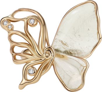 Architectural ring inspired by transformation with dimensional sculpted wings for an ethereal statement look.