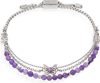 Open your wings and let yourself soar. When you’re ready to embark on what’s next, wear the Stranded Butterfly Bracelet Set which features three bracelet strands. One has a butterfly charm accented with a violet cubic zirconia crystal, one has a string of sparkling semi-precious amethyst beads, and one silver chain. The Stranded Collection features an all-new, interchangeable design. Bracelet strands attach to an adjustable length keeper, included with the set. Swap out strands from different pieces and combine them to make a style that’s all your own.