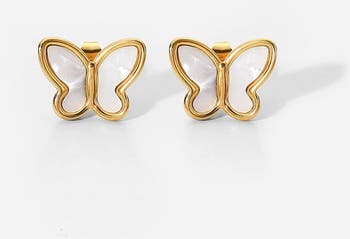 Enhance your jewelry collection with these exquisite Gold Butterfly Stud Earrings featuring stunning Mother of Pearl inlay. Crafted with precision, these elegant earrings combine the timeless beauty of gold with the iridescent charm of Mother of Pearl, creating a captivating accessory for any occasion. Perfect for adding a touch of sophistication to your everyday look or completing a glamorous evening ensemble. Shop now and experience the luxurious allure of our Gold Butterfly Stud Earrings.