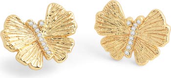 The brand's ginkgo leaf motif metamorphoses into graceful butterfly earrings, intricately crafted from 18-karat-gold-plated brass and hand set with sparkling crystals.
