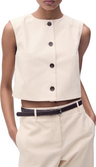 A row of buttons neatly contrast against the crisp cotton fabrication of this top fashioned with an abbreviated hem that looks great when styled with high-waist garments.