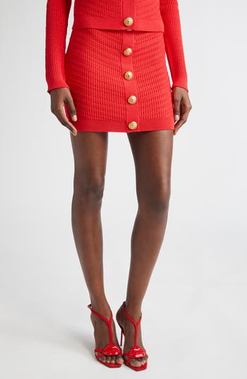 Contoured ribbing showcases your shape in this quintessentially Balmain miniskirt polished with signature lion-head buttons.