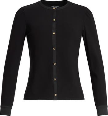 Puff shoulders frame this front-button knit top made with a kiss of stretch for a close fit.