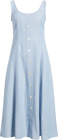 A novelty button placket adds style points to a summery dress crafted in a lightweight linen blend and popped with handy pockets.
