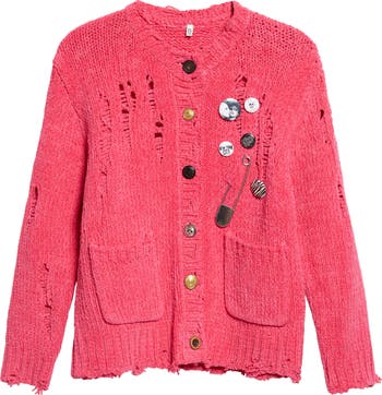 Chris Leba gives typically prim knitwear the '90s-grunge treatment in this cotton cardigan with threadbare rips, shredded edges and punk-coded accessories—think rebellious buttons and oversized safety-pin hardware.