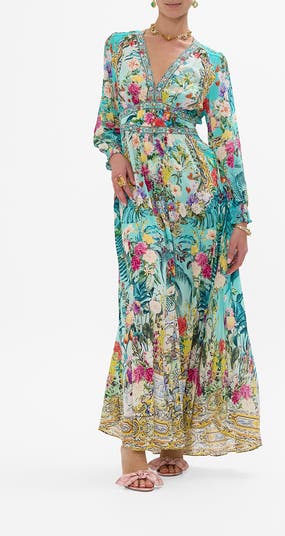 Designed in Australia, The Gardens Of Queluz Button Dress With Shaped Waistband is inspired by the romantic and forever artful Queluz Palace Lovingly handcrafted, this timeless CAMILLA silk maxi dress features a soft blouse bodice and a shaped waistband that cinches the figure. This elegant piece showcases a shirred back panel before cascading into a softly gathered maxi skirt.