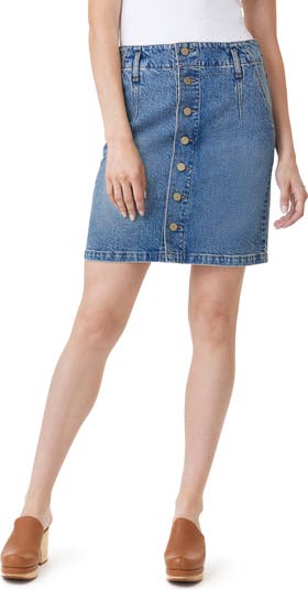 Exposed front buttons bring retro appeal to a high-waist miniskirt cut from low-stretch denim in the perfect light-blue wash.