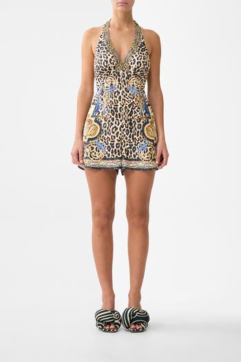 Inspired by turquoise seas and azure skies, the Sevillian Style Button Front Halter Playsuit is a handcrafted silhouette designed by our in house artisans. Reimagined in an exclusive limited edition print, this daring halter neck playsuit homes a dramatic V neckline with open back detailing and is finished with button up front details and crystal embellishments.